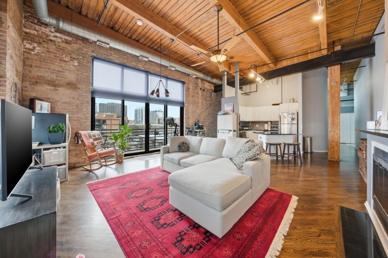 Stunning Corner Top-Floor 1 Bed / 1 Bath Brick & Timber Loft in the Heart of the South Loop! This sun-drenched home features a spacious open-concept floor plan with soaring 14' ceilings and beautiful dark hardwood floors throughout. The updated kitchen offers white cabinetry, stainless steel appliances, an island, and granite countertops perfect for both everyday living and entertaining. Enjoy seamless indoor-outdoor living with a large private wraparound balcony. The fully renovated bathroom adds a fresh, modern touch, while the unit provides abundant closet space plus additional storage. indoor heated garage parking Unbeatable location! Just steps to the lakefront, parks, museums, Soldier Field, and some of the best dining and entertainment the city has to offer!